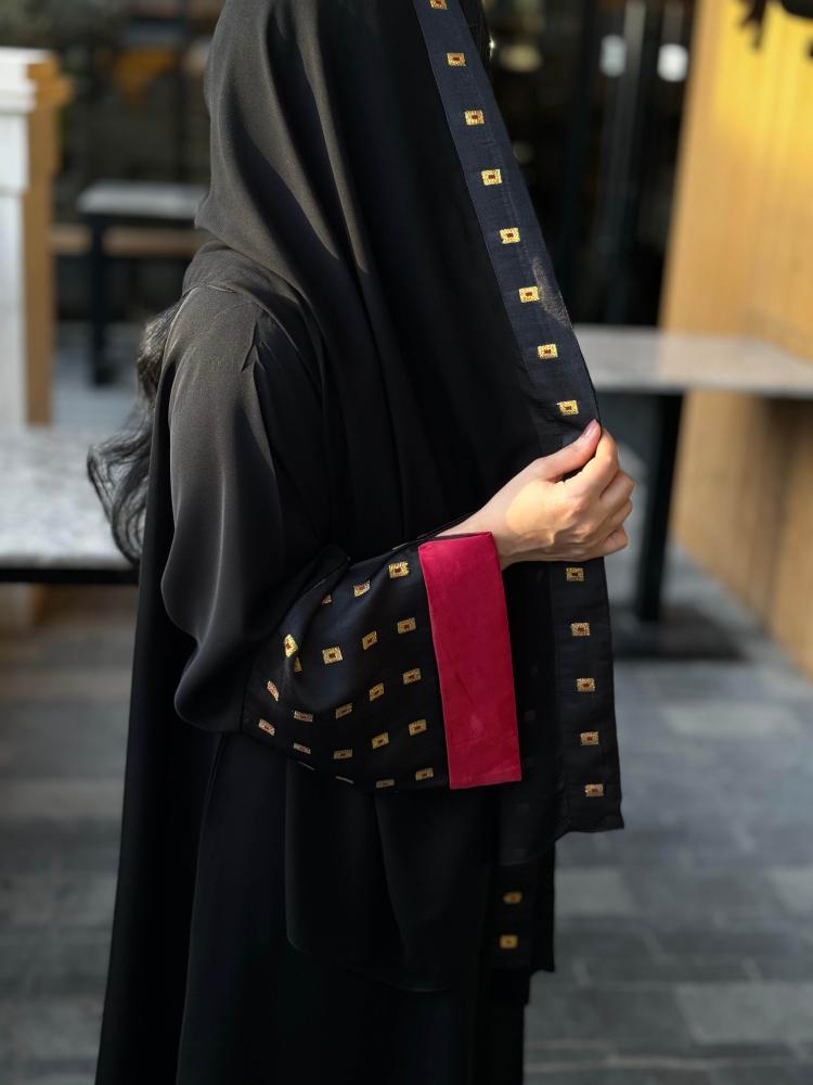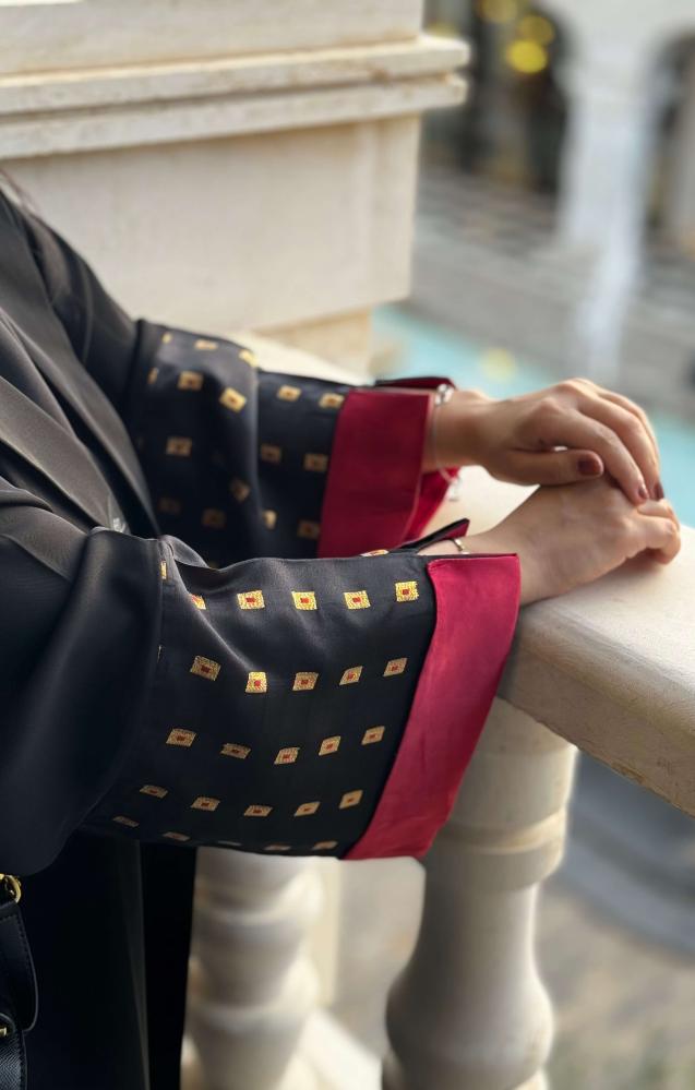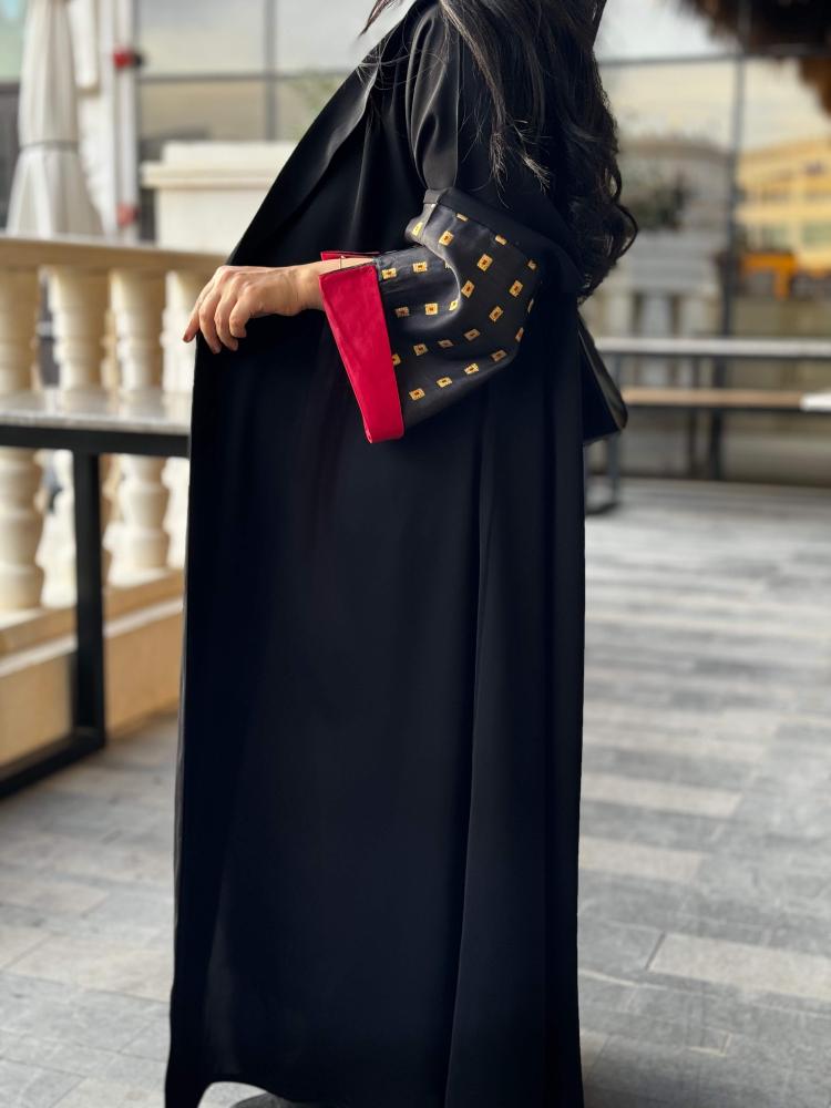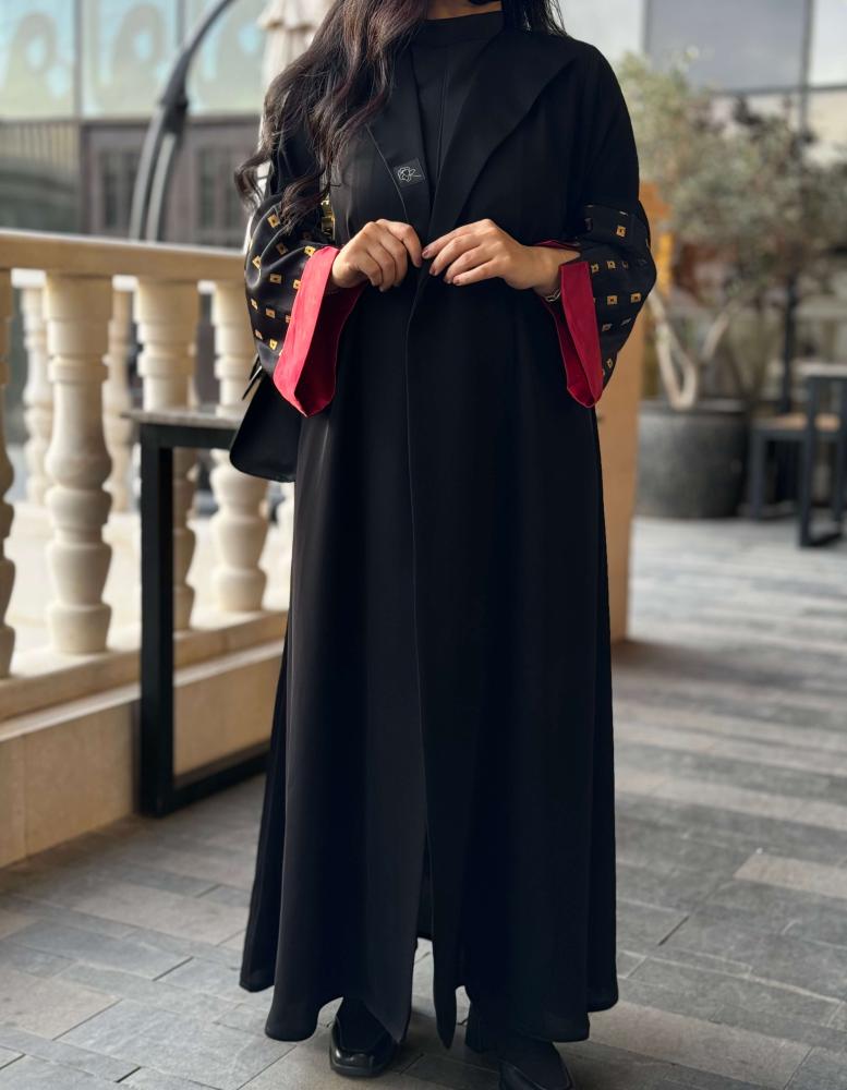 القماش : انترنت أسود ، أكمام تفته اسود خارجي وتفته احمر داخلي + طرحه
