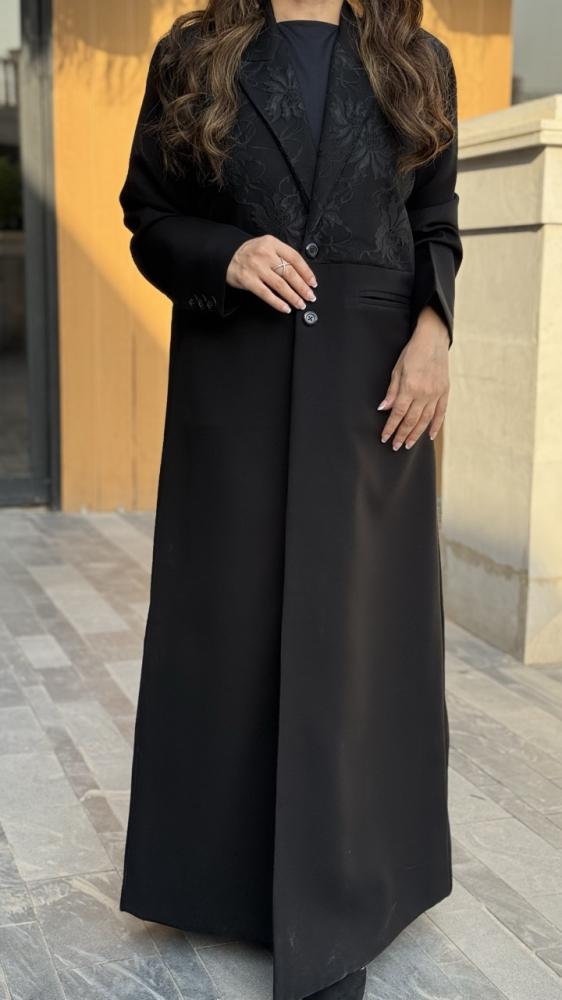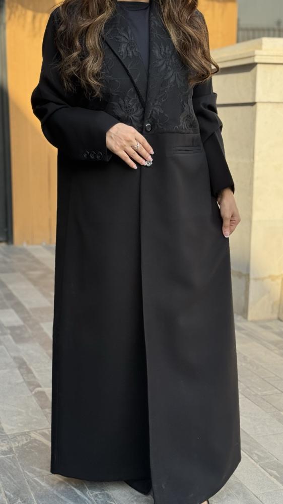الوصف : عباية بليزر مبطن مع ياقة قلاب رسميه . الجزء العلوي قماش دانتيل من الصدر والظهر . جيوب أمامية . ازرار أمامية وازرار على طرف الكم . وكتافات اسفنج ناعمه ( لتجعل إطلالتك اكثر فخامة ) . طرحة سادة أسود