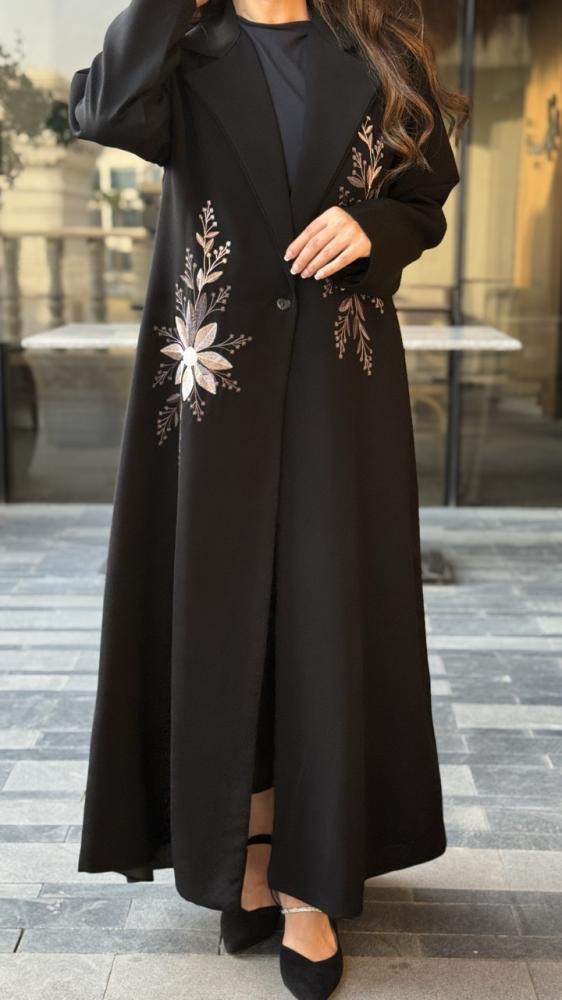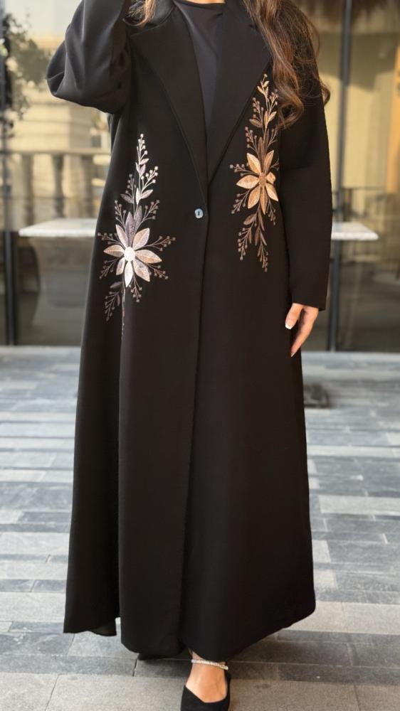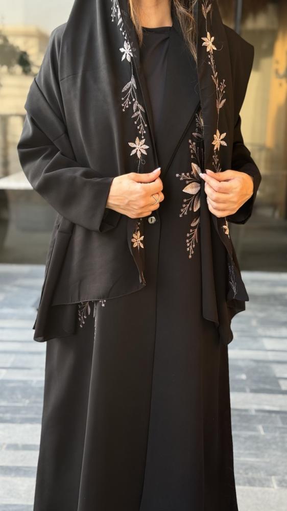 الوصف : عباية بليزر مبطن مع ياقة قلاب رسميه وأزرار أمامية مع تطريز بالخيط الملون من الامام وكتافات اسفنج ناعمه ( لتجعل إطلالتك اكثر فخامة ) . طرحة أسود مع تطريز خيط ملون على الطرف .