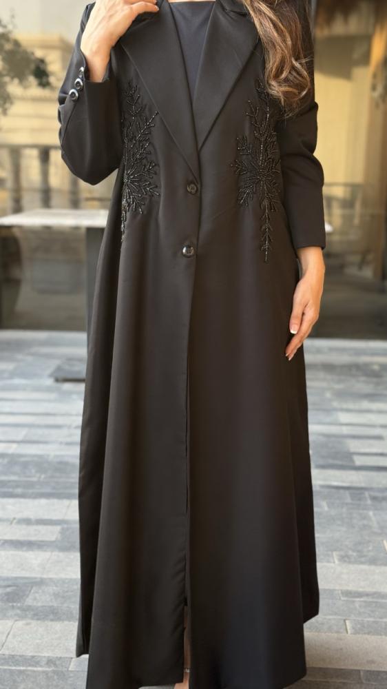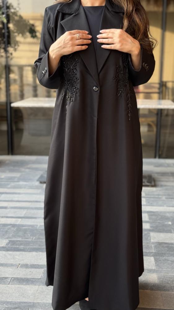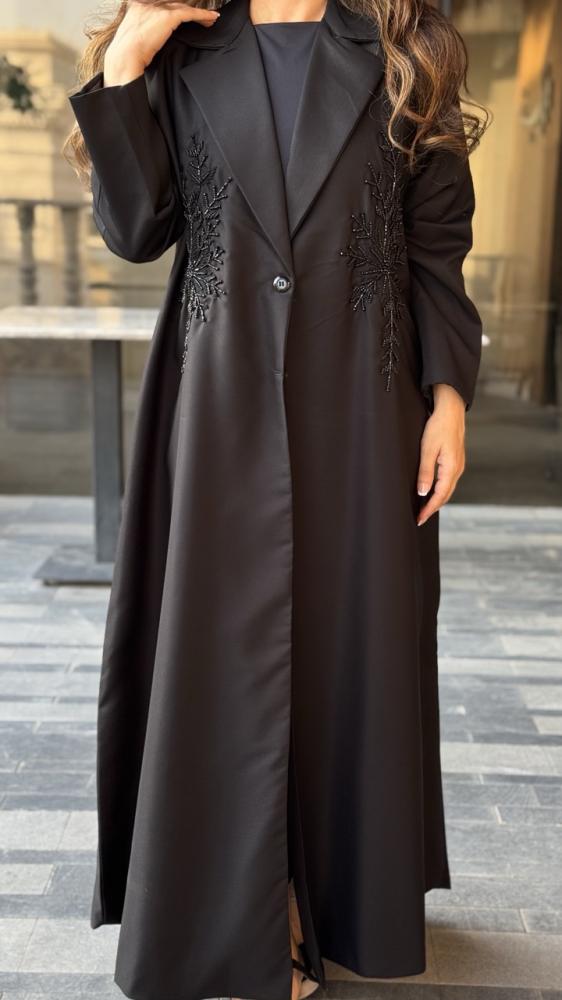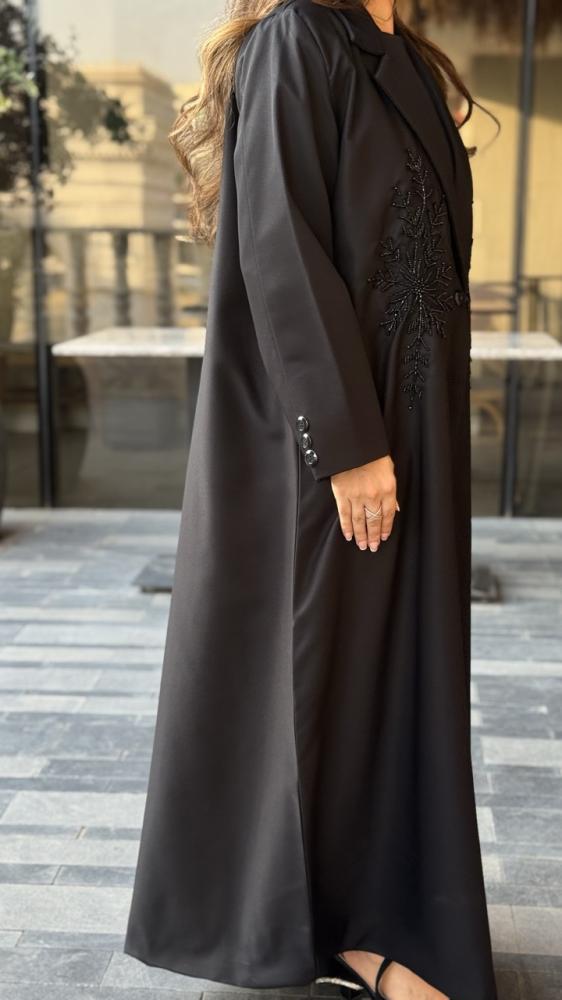 بليزر رسمي مبطن القماش : تفته ناعم مقلوب لون أسود . الوصف : عباية بليزر مبطن مع ياقة قلاب رسميه وأزرار أمامية وأزرار على طرف الكم مع تطريز بالخيط والخرز وكتافات اسفنج ناعمه ( لتجعل إطلالتك اكثر فخامة ) . طرحة سادة أسود