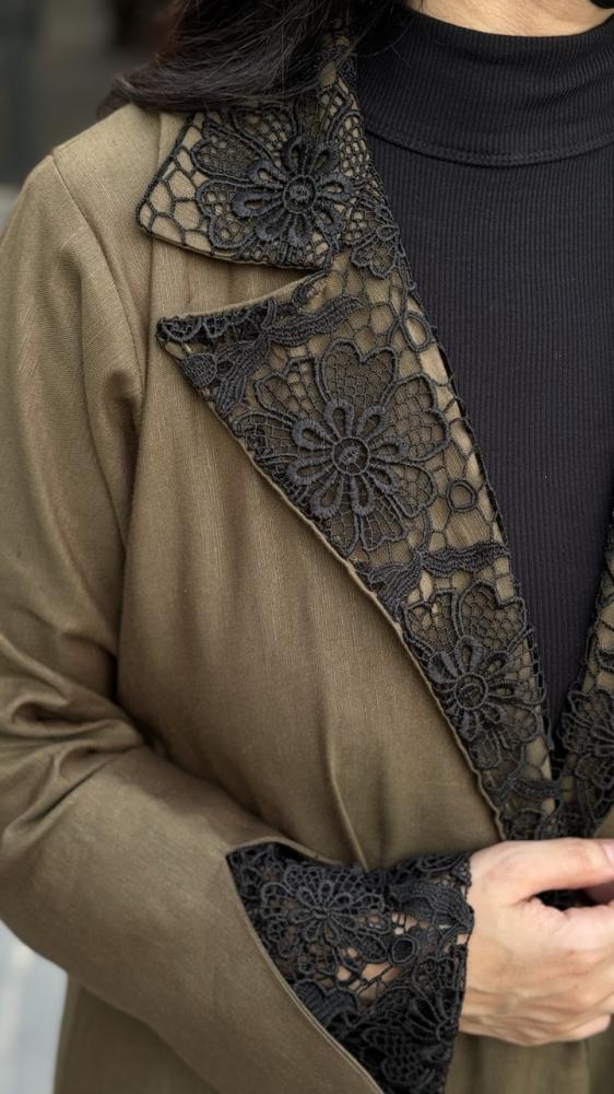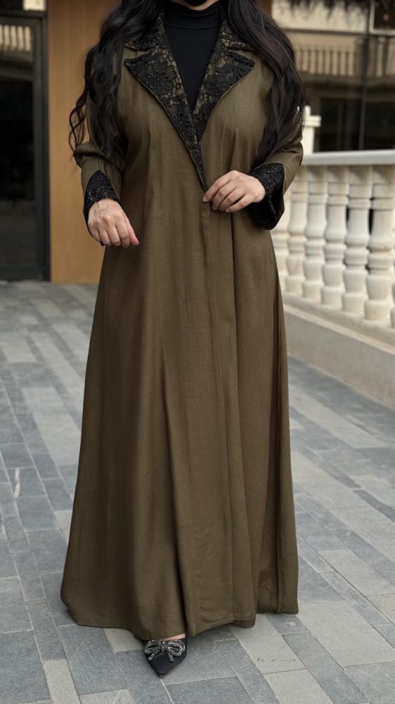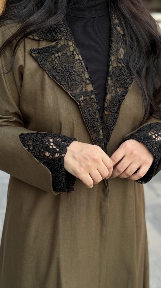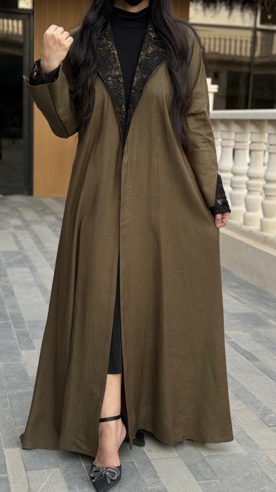 عباية رسمية القماش : لنن فاخر زيتي مع دانتيل اسود فاخر . الوصف : عباية رسمية قصة بليزر ربع كلوش باللون الزيتي مع ياقة دانتيل وأكمام طرف دانتيل . طرحه زيتي طرف دانتيل اسود .
