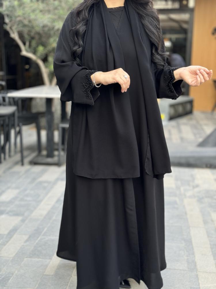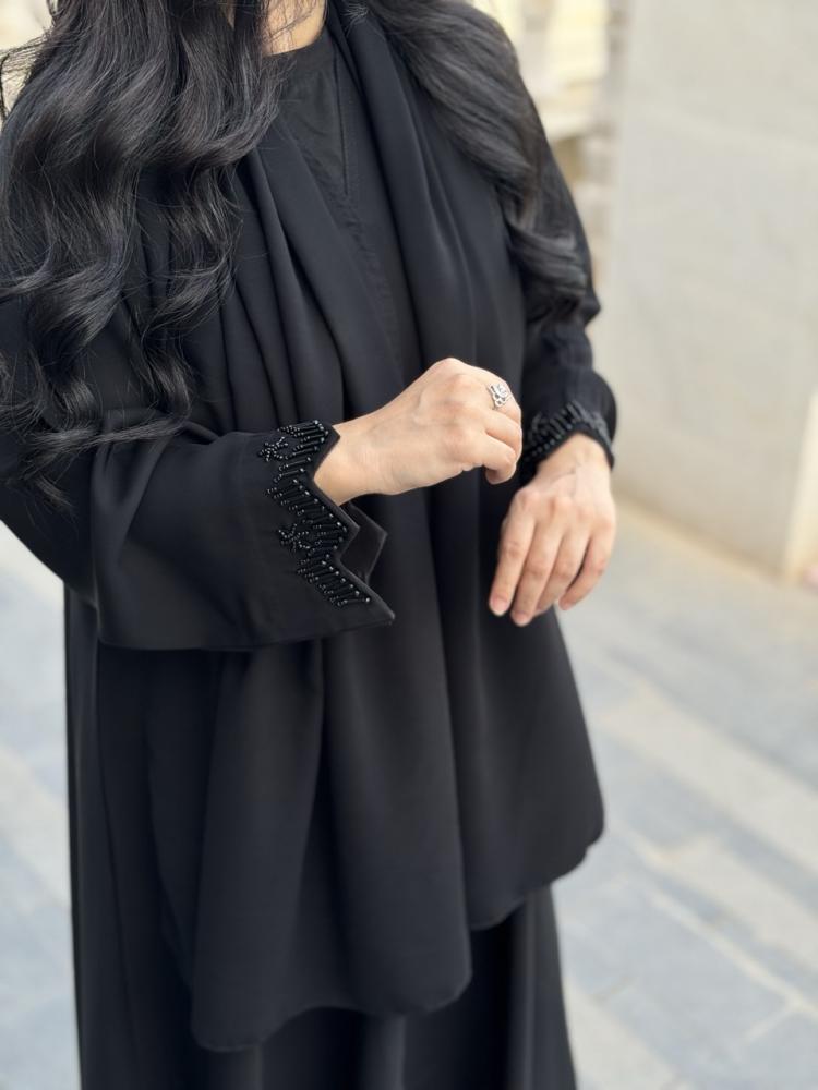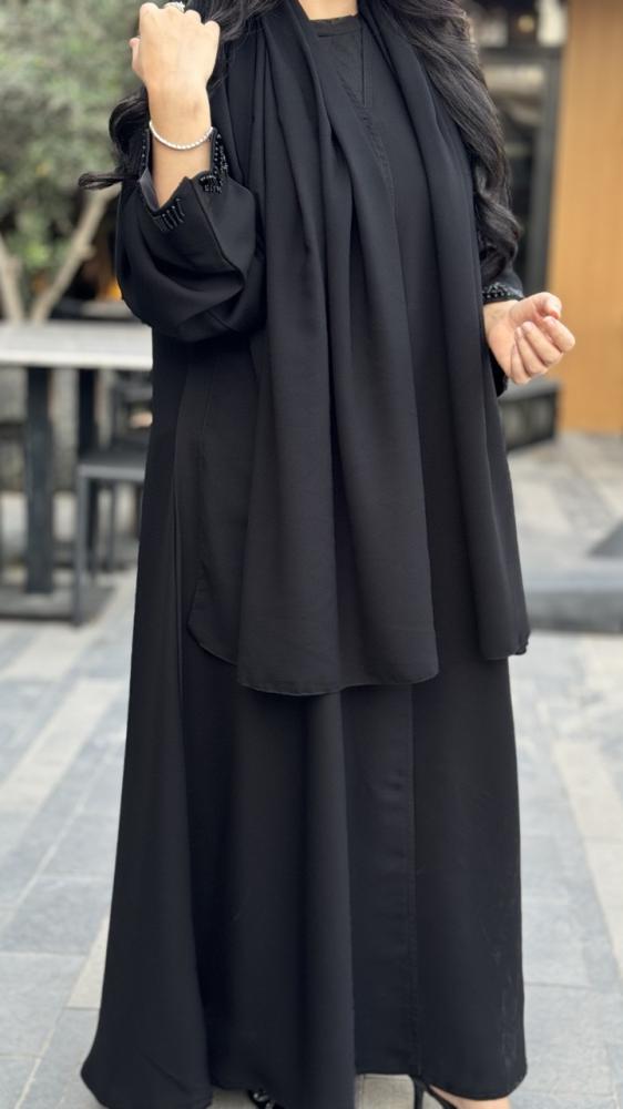 عباية عملية مناسبة للإستخدام اليومي والدوام . القماش : إنترنت صيفي . الموديل : عباية نص كلوش مع تطريز بألاكمام . طقطق وطرحة .