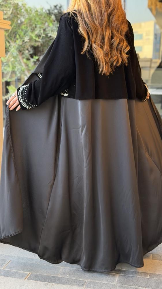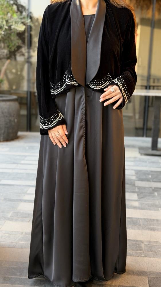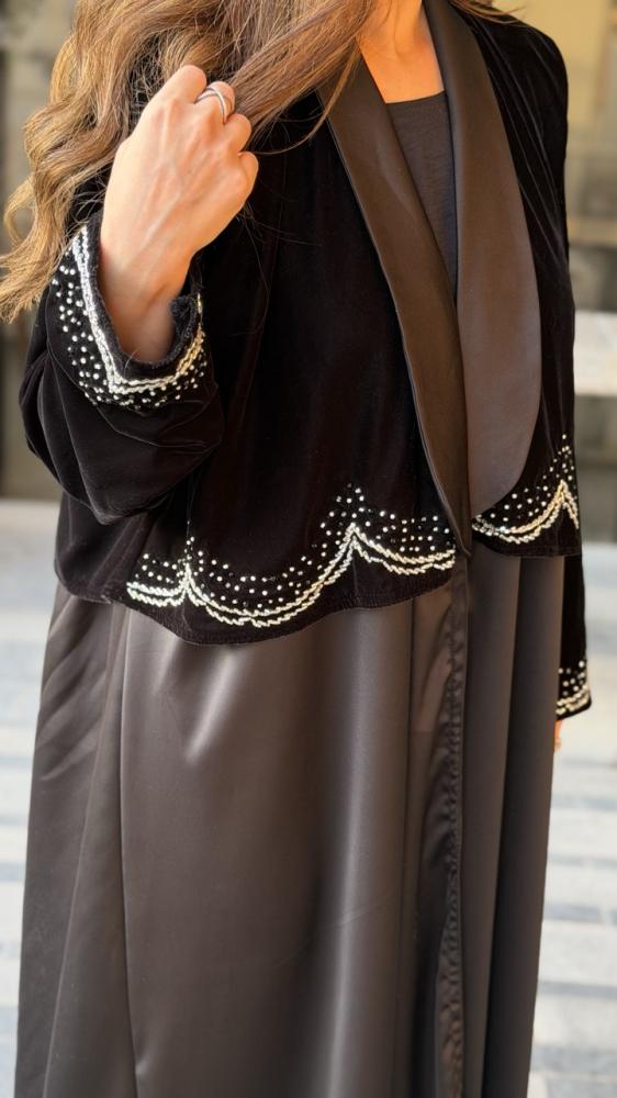 عباية شتويه القماش : مخمل أسود . تفته حرير أسود . الوصف : عباية نص كلوش الجزء العلوي مخمل والياقه مع الجزء السفلي من التفته الحرير . تطريز على اطراف الجاكيت من الامام واطراف الكم . طرحة اسود طرف مخمل .
