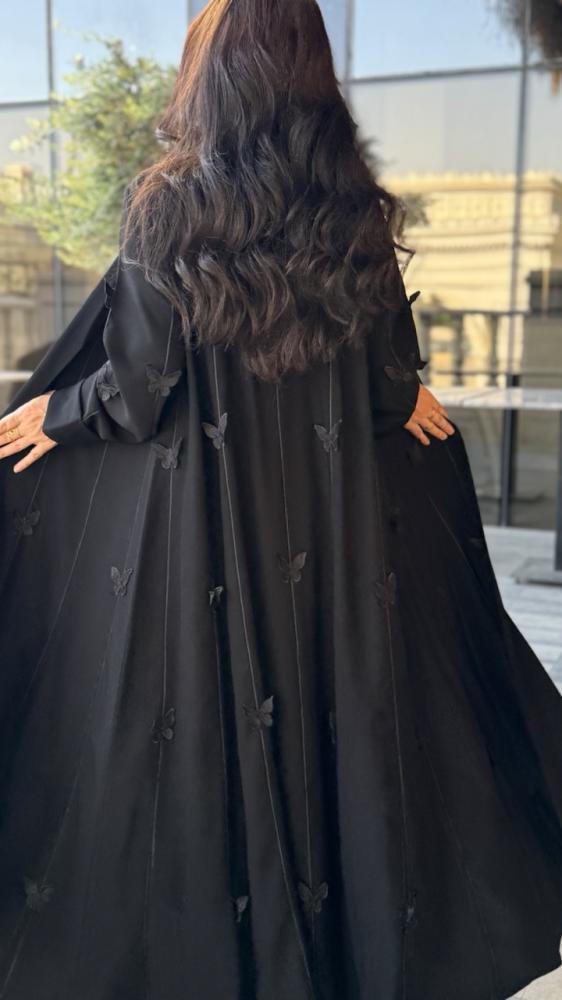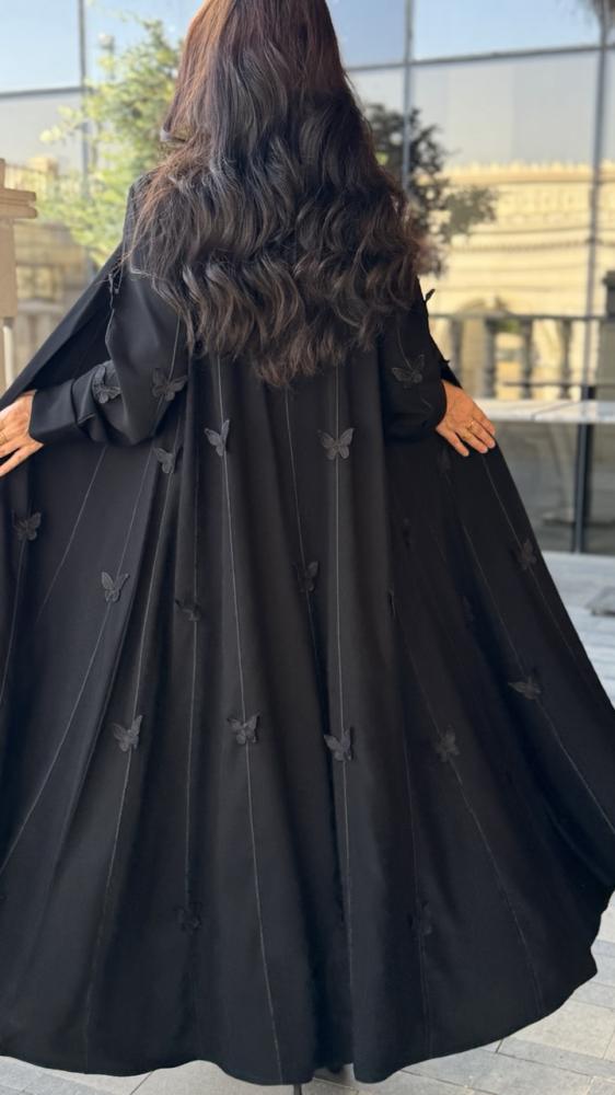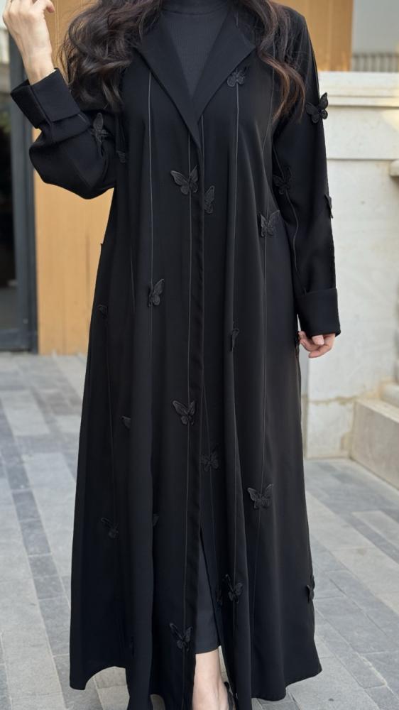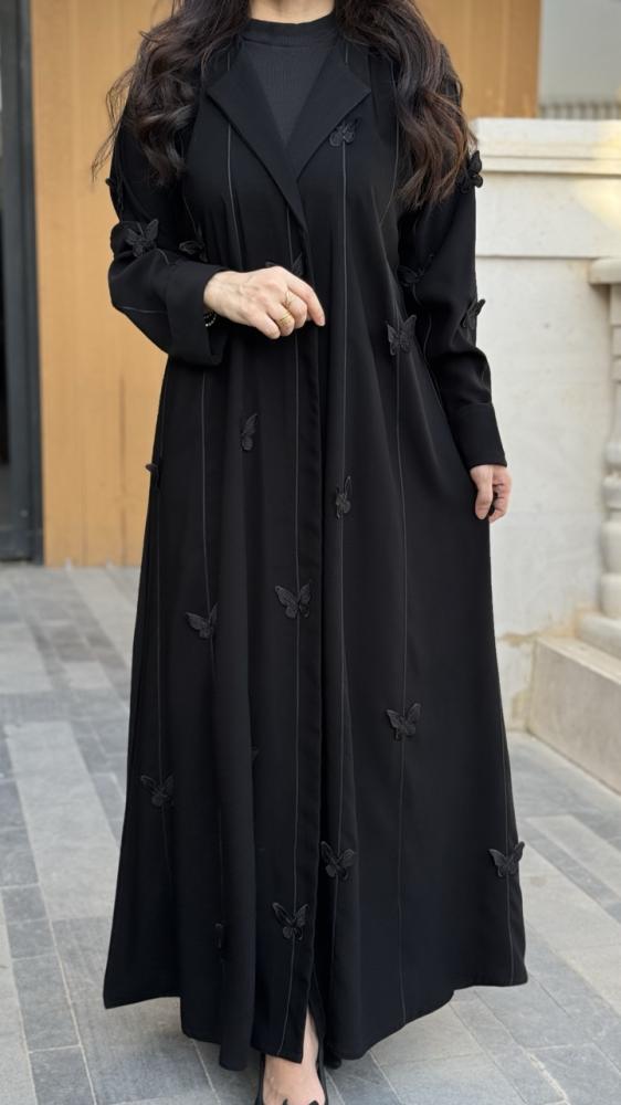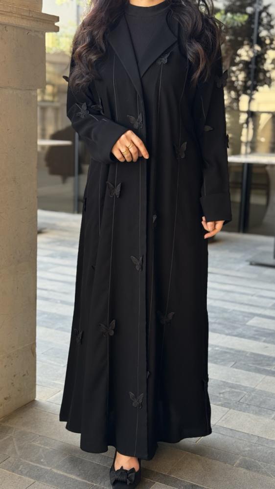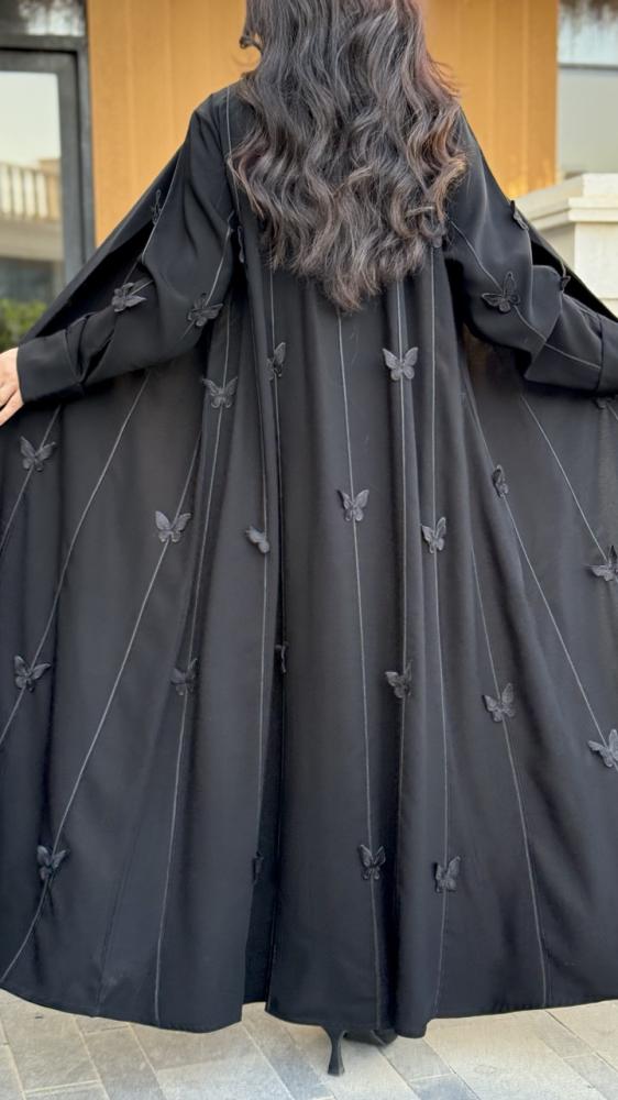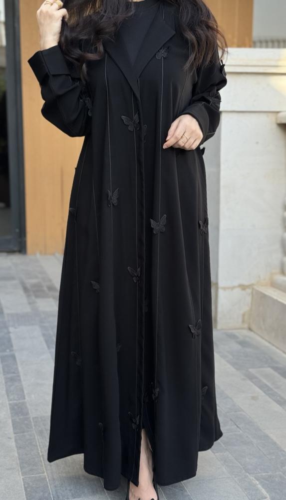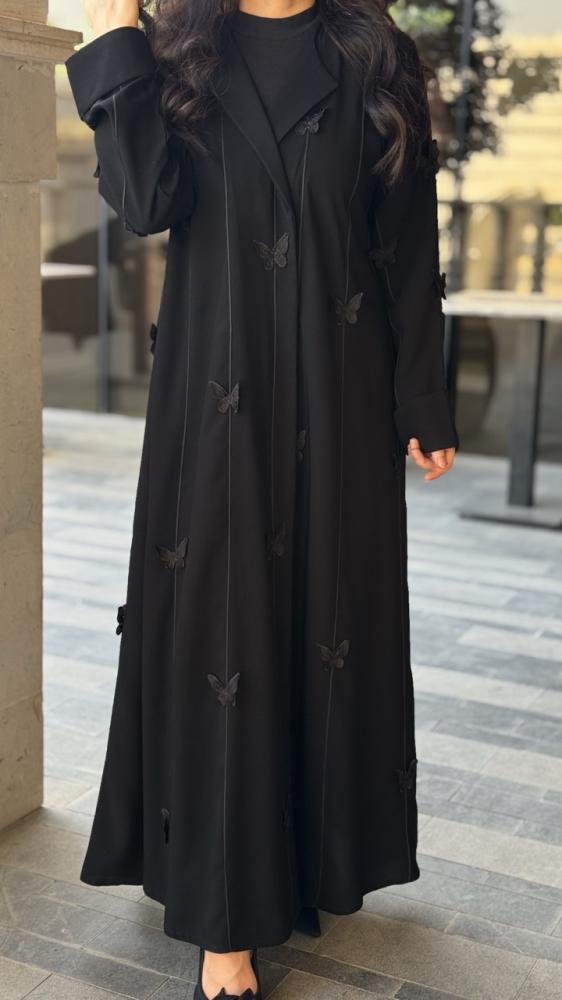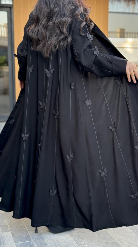 الوصف : عباية نص كلوش مع ياقه صغيرة مرنه ( يمكنك تحويلها الى ياقه دائرية بالكوي فقط ) . خطوط قيطان بالطول لون أسود مع تركيبات بارزة على شكل فراشات مطرزة بالخيط الأسود .