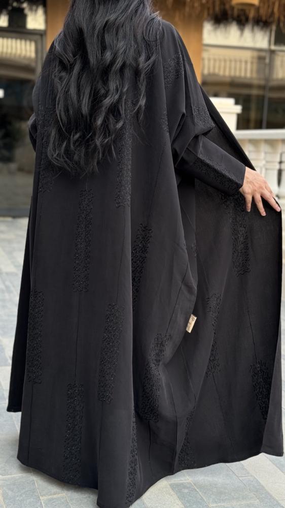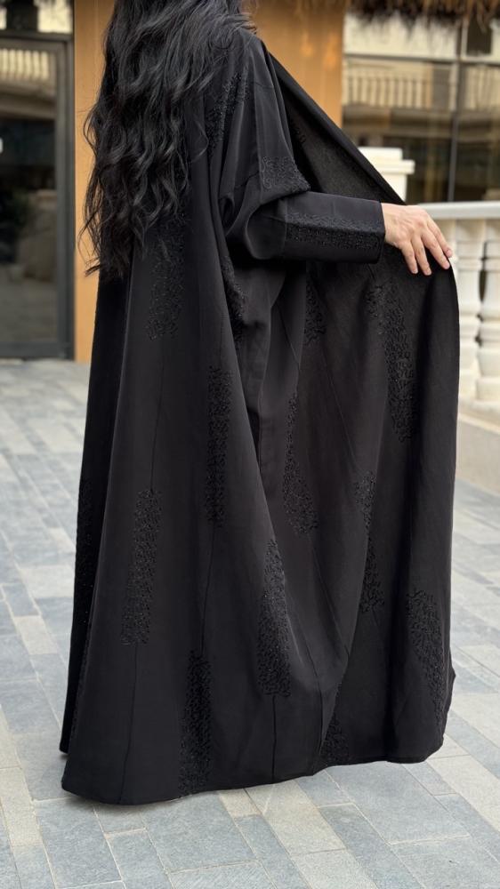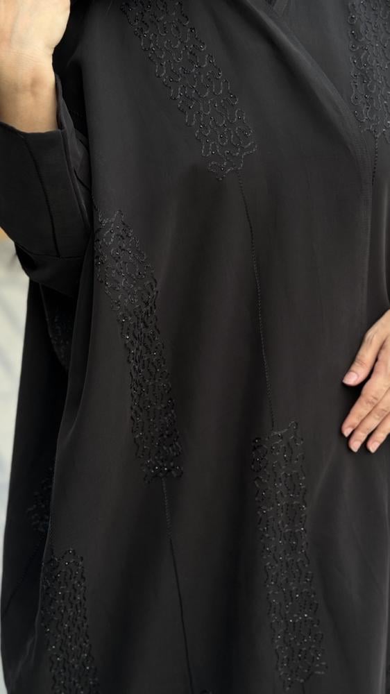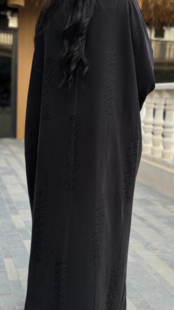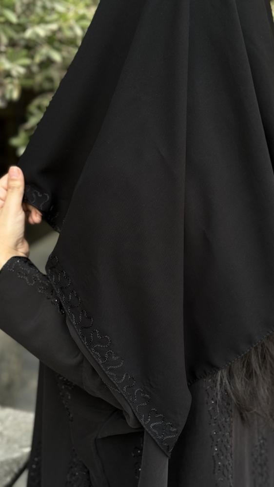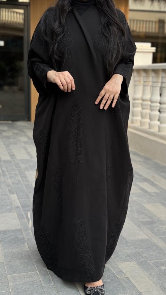 عباية مناسبات وسهرة القماش : كريب بلاك بيري ياباني . الوصف : عبايه بشت بتطريز أسود ناعم كامل أمام وخلف ، طرحه طرف تطريز .ملاحظة: اختاري المقاس المناسب من ناحية الطول الكلي وطول الكم فقط العرض اوسع من المعتاد .