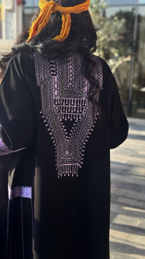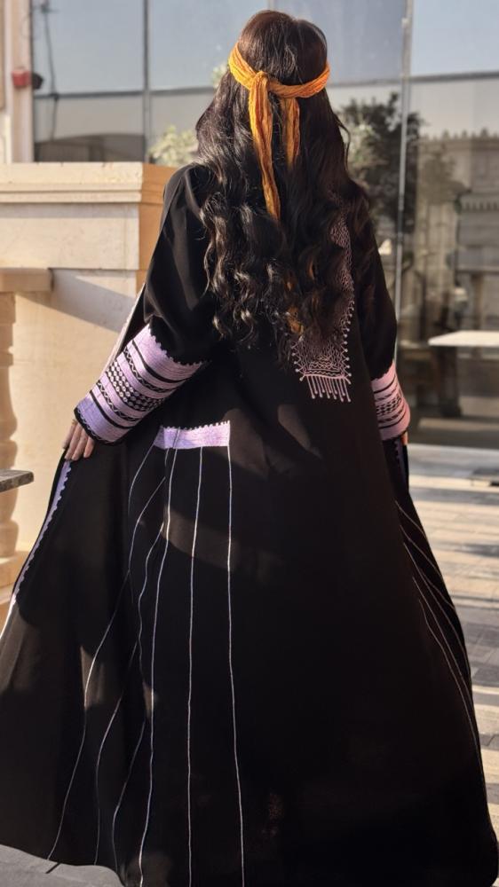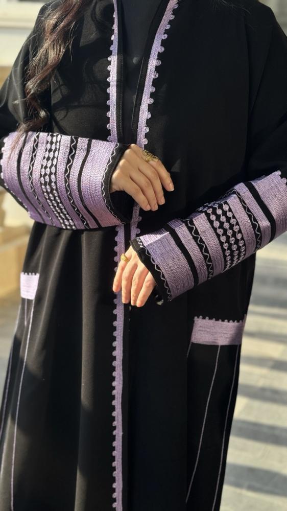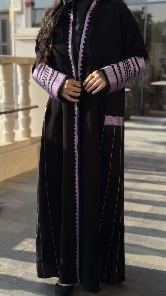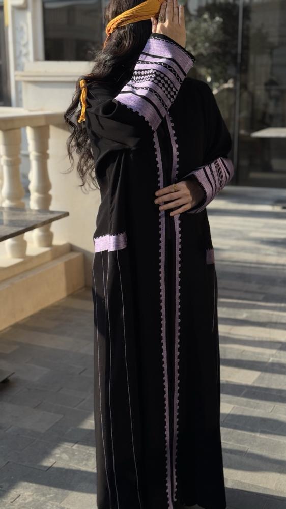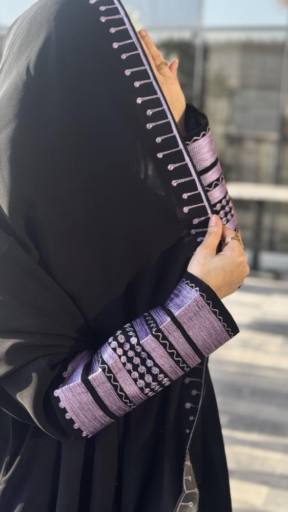 الوصف : عباية نص كلوش تطريز خيوط حرير فاخر باللون البنفسجي على الاكمام والجوانب والظهر ومن الأمام . مع طرحة طرف تطريز على طول الطرحة .