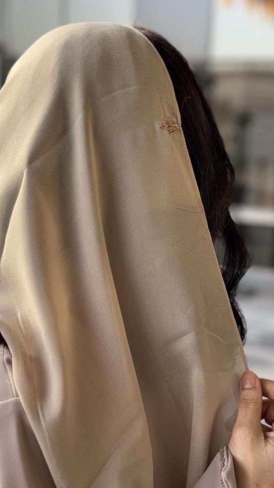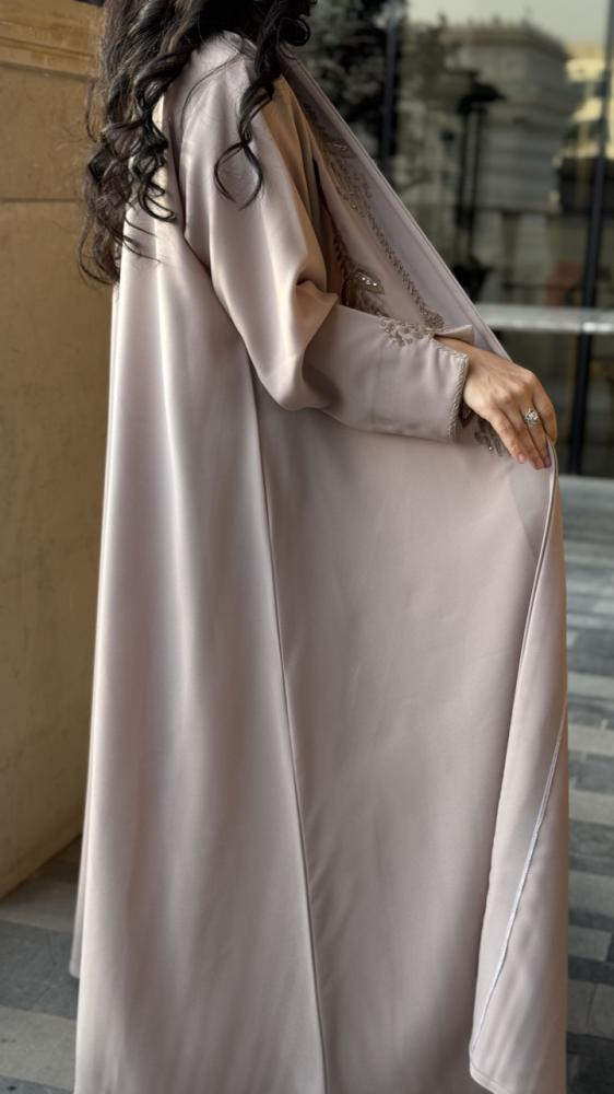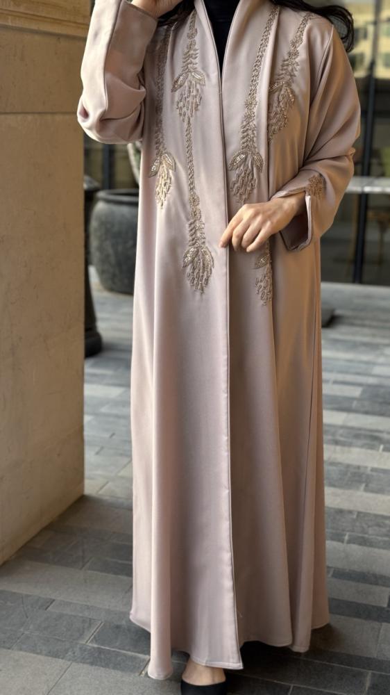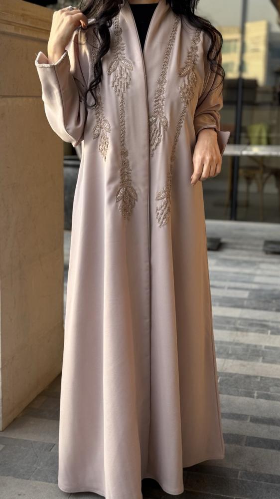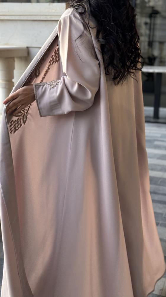 عباية مناسبات . القماش : باربي بيج . الوصف : عباية راقية نص كلوش مع تطريز فاخر من الامام واطراف الاكمام . مع طرحة اسود تطريز طرف .