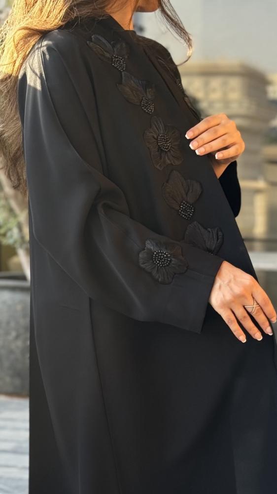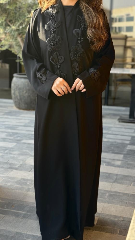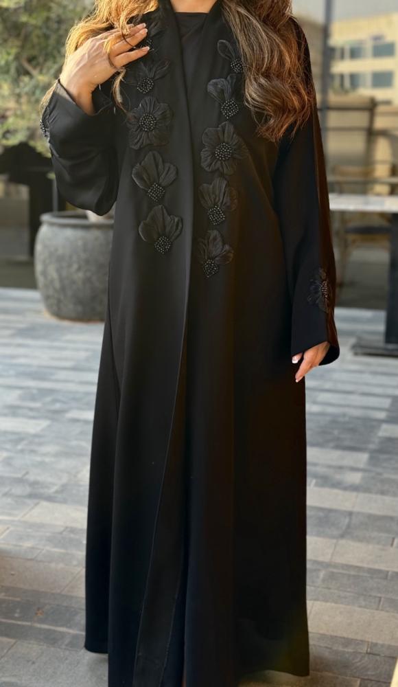 عباية مناسبات القماش : انترنت اسود الوصف : عباية ربع كلوش تطريز ورد بارز مع خرز اسود على الصدر وطرف الكم . كم مربع . مع طرحة اسود بطرف خرز اسود .